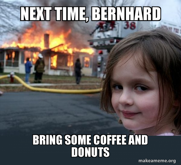 Next Time Bernhard Bring Some Coffee And Donuts Disaster Girl Make A Meme
